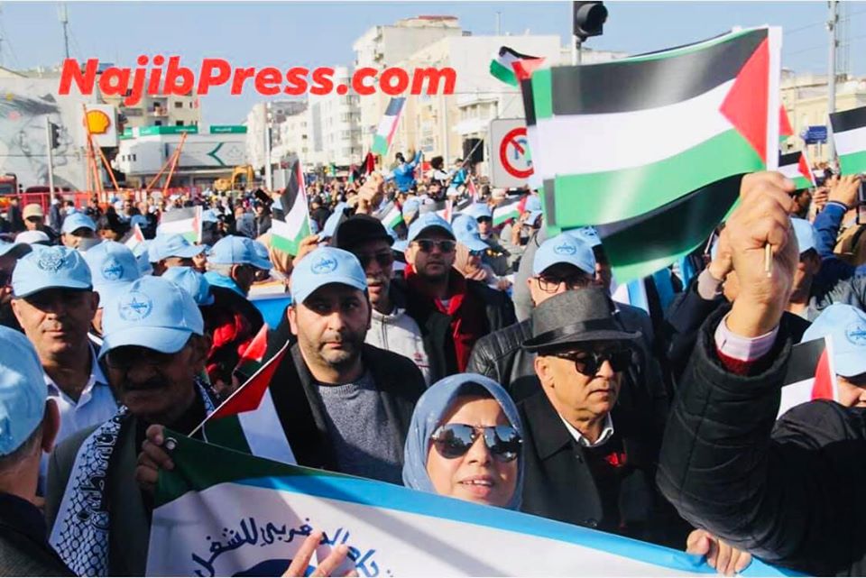 وعبر مناضلي ومناضلات الإتحاد المغربي للشغل، عن رفضهم القاطع لخطة "ترامب - نتنياهو" المسماة صفقة القرن، التي تهدف إلى تصفية القضية الفلسطينية، و إلى جعل القدس عاصمة للكيان الصهيوني الغاصب، و إلى الإجهاز على كافة الحقوق الوطنية و التاريخية للشعب الفلسطيني، و في مقدمتها الحق في إقامة دولته المستقلة كاملة السيادة، وذلك تلبية لنداء الاتحاد المغربي للشغل الداعي للمشاركة في المسيرة الوطنية والشعبية ليوم 09 فبراير 2020 معبرا من خلاله رفضه القاطع لخطة " ترامب - نتنياهو" المسماة صفقة القرن و ذلك تلبية لنداء الاتحاد المغربي للشغل الداعي للمشاركة في المسيرة الوطنية والشعبية ليوم 09 فبراير 2020 معبرا من خلاله رفضه القاطع لخطة " ترامب - نتنياهو" المسماة صفقة القرن، وهذا من موقعه الطلائعي في قيادة النضال الوطني و التحرري ضد مختلف أشكال الاستعمار و الهيمنة،